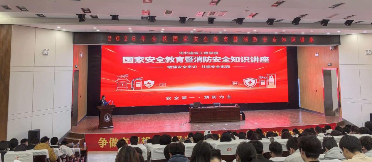 2026年4月14日下午,我校在新能源报告厅成功举办了一场国家安全教育暨消防安全知识讲座。本次活动由学校安全工作处与团委联合主办,各院系新入职人员、安全员、物业及后勤工作人员以及300余名学生代表共同参加。
