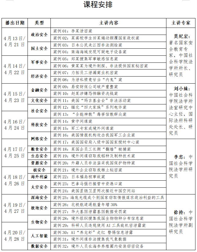 活动邀请知名国家安全教育专家、中国社会科学院法学所所长莫纪宏研究员领衔主讲,法学所法宣研究中心主任、国际法所科研处处长刘小妹研究员,法学所党内法规研究中心主任李忠研究员,法学所徐持副研究员,精心录制了总体国家安全观20个领域32个国家安全教育公开典型案例。