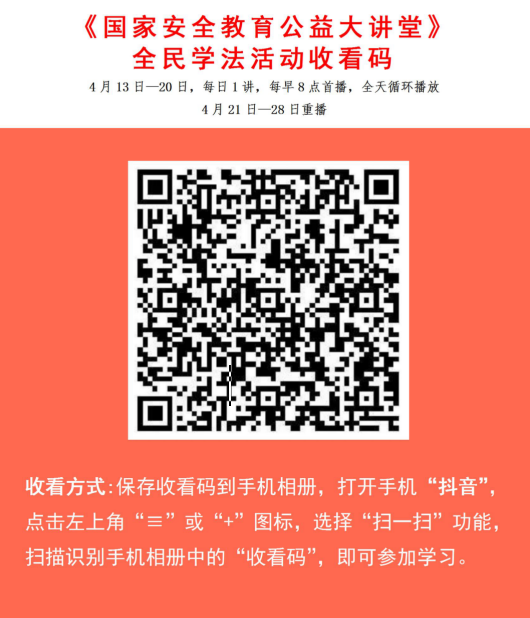 各地区各部门可将上述“收看码”广泛转发,方便广大干部群众扫码学习。视频全天循环播放,可结合个人实际安排学习时间。参与学习后可在线获得“国家安全教育公益大讲堂”学习证书。