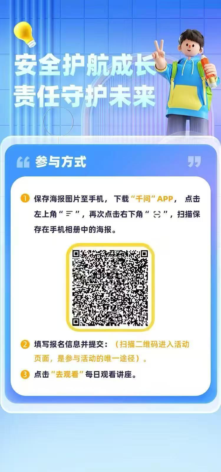 请各班级班主任将此通知和宣传海报及一并转发至学生班级群,全体师生进入千问观看学习,要求全员师生观看。